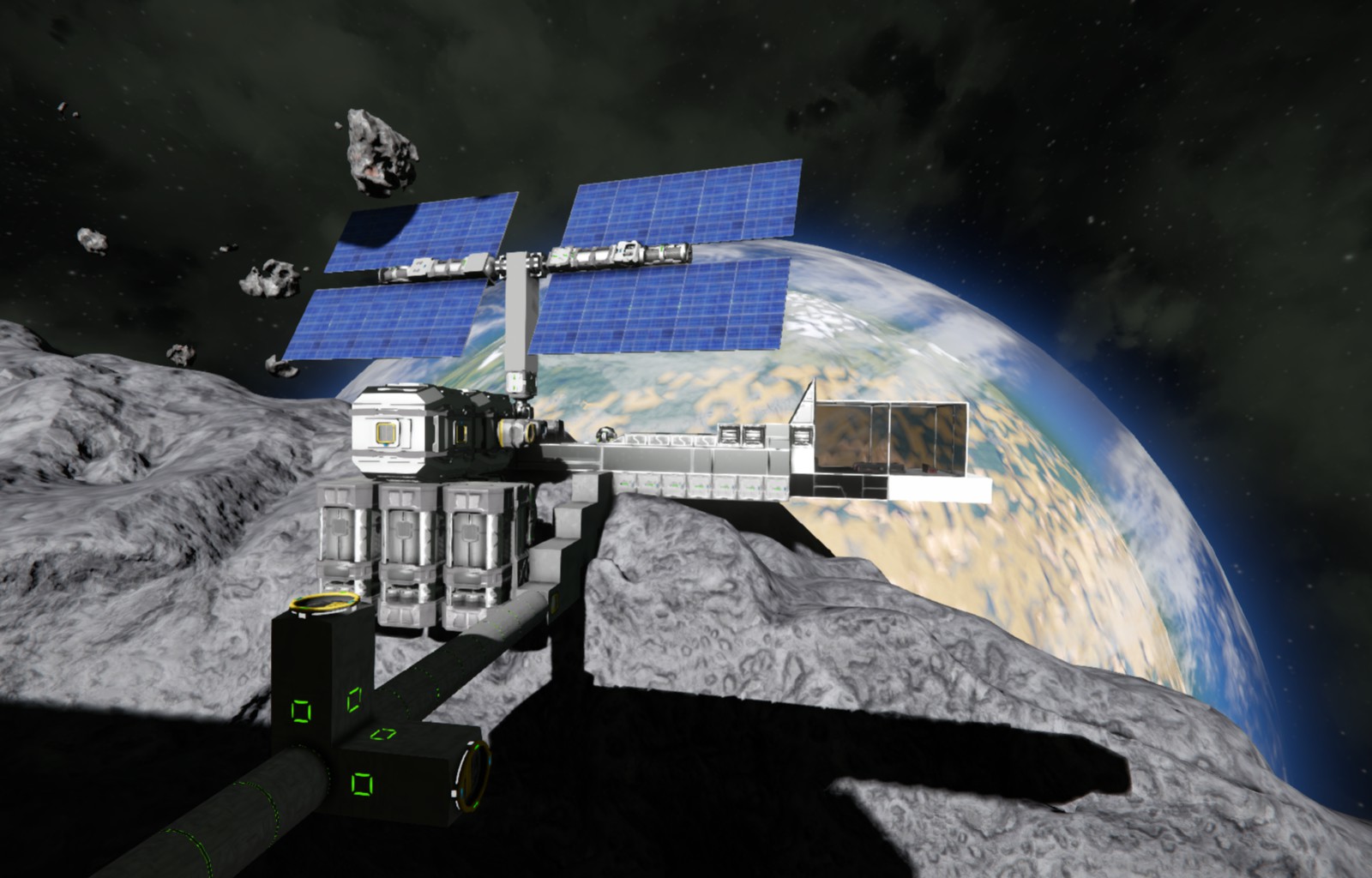 Great Lakes Skydock 1 Great Lakes Skydock was built on a rich asteroid closer to the poles for better solar array coverage and in a stable freefall orbit for easy construction and safe docking. Unlike New Chicago Station, this facility was built with a clear plan and design structure, with a docking arm, refinery / mechanical block, and a habitation block.